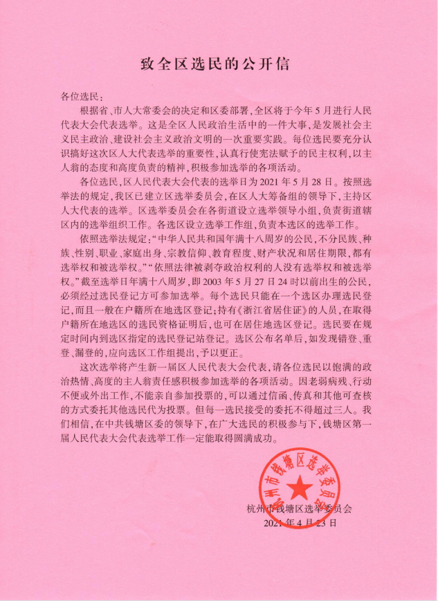 来源:杭州市钱塘区选举委员会发布时间:2021-04-26浏览次数:1207