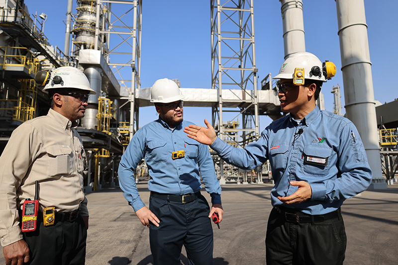 2022年11月27日,在沙特西部城市延布,中沙延布炼厂的员工在交流。新华社记者 王海洲 摄