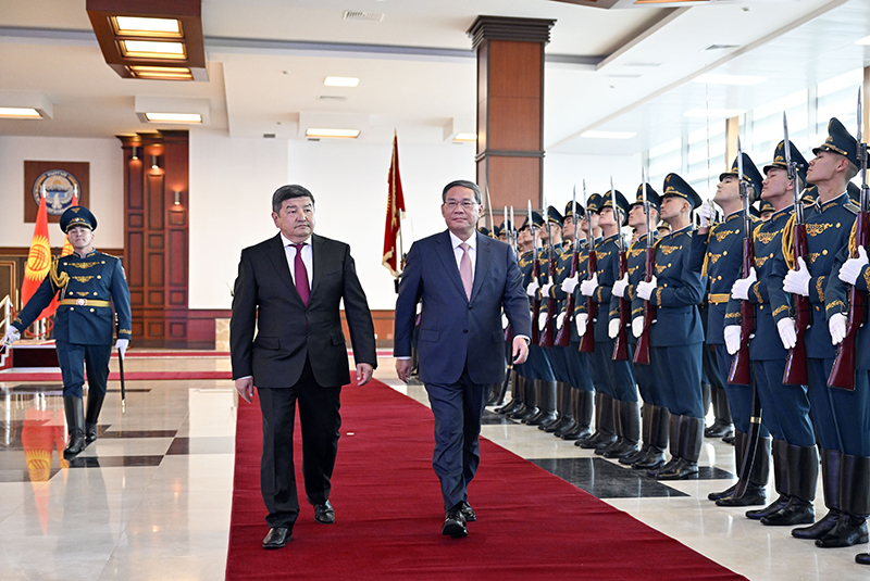 扎帕罗夫在机场为李强举行隆重欢迎仪式。军乐队高奏中吉两国国歌。李强在扎帕罗夫陪同下检阅了仪仗队。